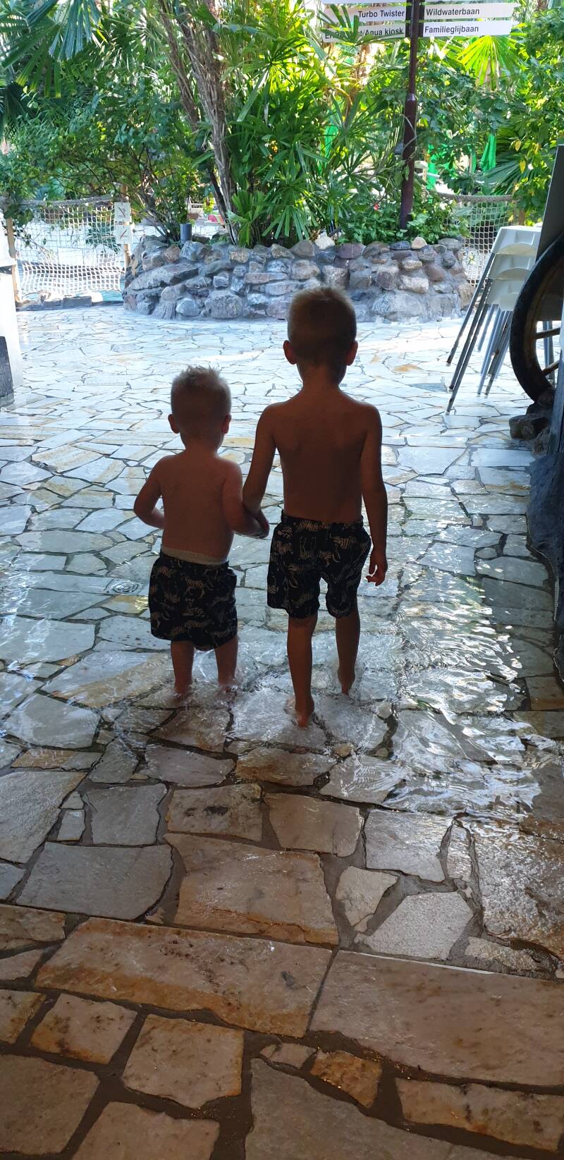 Nou hehe we zijn er en de 5 dagen vakantie die we nog over hebben kunnen beginnen. We eten lekker met de jongens en gaan nog langs de minidisco. De 2 dagen daarna lig ik op bed met buikgriep, koorts,spugen, diarree de hele mik mak. Ondertussen denkt het hele resort dat Arno een alleenstaande vader is. Maar jongens we zijn tenslotte eindelijk op vakantie dus het mag de pret allemaal niet drukken.. De 3 dagen die volgen en ik weer beter ben zijn heerlijk. We genieten met volle teugen van die 2 kleine blonde koppen in de branding en bij elk schopje in mijn buik fantaseer ik hoe het zou zijn als volgend jaar Liv erbij is. Hoe ik dan met zoon lekker spekbabietje van een maand of 8 in zoon geel bandje in de zee zou dobberen. Elke avond zitten we vooraan bij de minidisco om Jack zijn dansmoves te bewonderen, en Bob is niet weg te slaan bij de glijbaan in het zwembad.