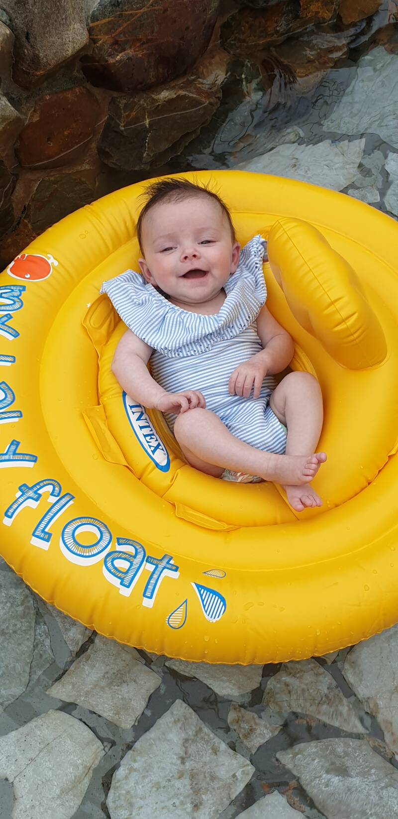 Als we aankomen ruimen we het huisje in en staan Jack en Bob te springen om te gaan zwemmen. Ikzelf stiekem ook, want het is de eerste keer voor Liv, en ik vind zwemmen met een baby altijd te leuk! Na alles ingepakt te hebben gaan we op pad naar het zwembad.