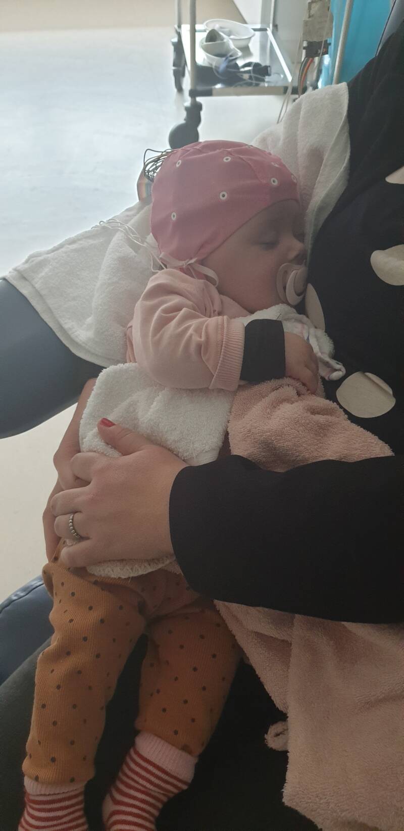 Ze gaat heel ons meisje langs met het apparaat en zegt gelukkig wel gelijk bij alles dat het er normaal uit ziet. Soms heeft Liv even geen zin om mee te werken en draait precies een andere kant op. Geef haar groot gelijk want ze duwt echt hard met dat ding en zegt steeds: nou kind werk nou eens mee! Ik heb niet echt het idee dat deze mevrouw nou heel veel plezier heeft in haar werk. Ik moet even door de kamer gaan lopen en springen in de hoop dat Liv weer omdraait en nog wat van zichzelf laat zien zodat ze alles kan bekijken. Dit gebeurd gelukkig en alles is goed! Hoppa geslaagd! We krijgen een paar foto's mee, waarvan 1 met haar handje, alsof ze ons een high five geeft.