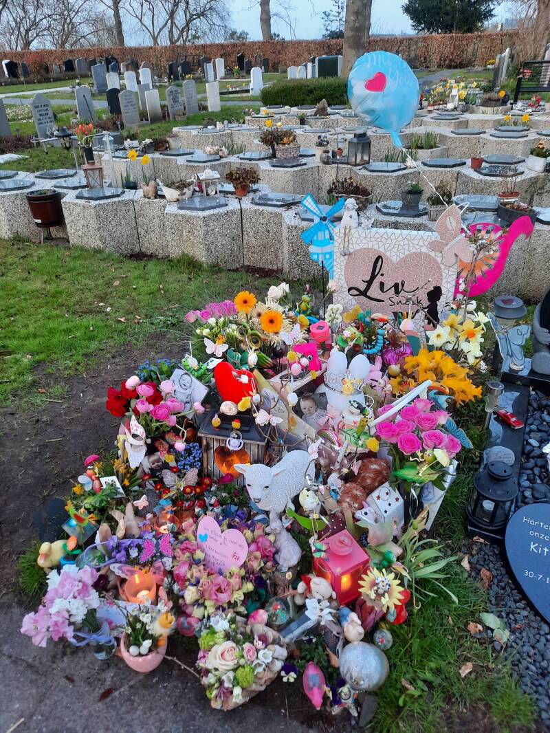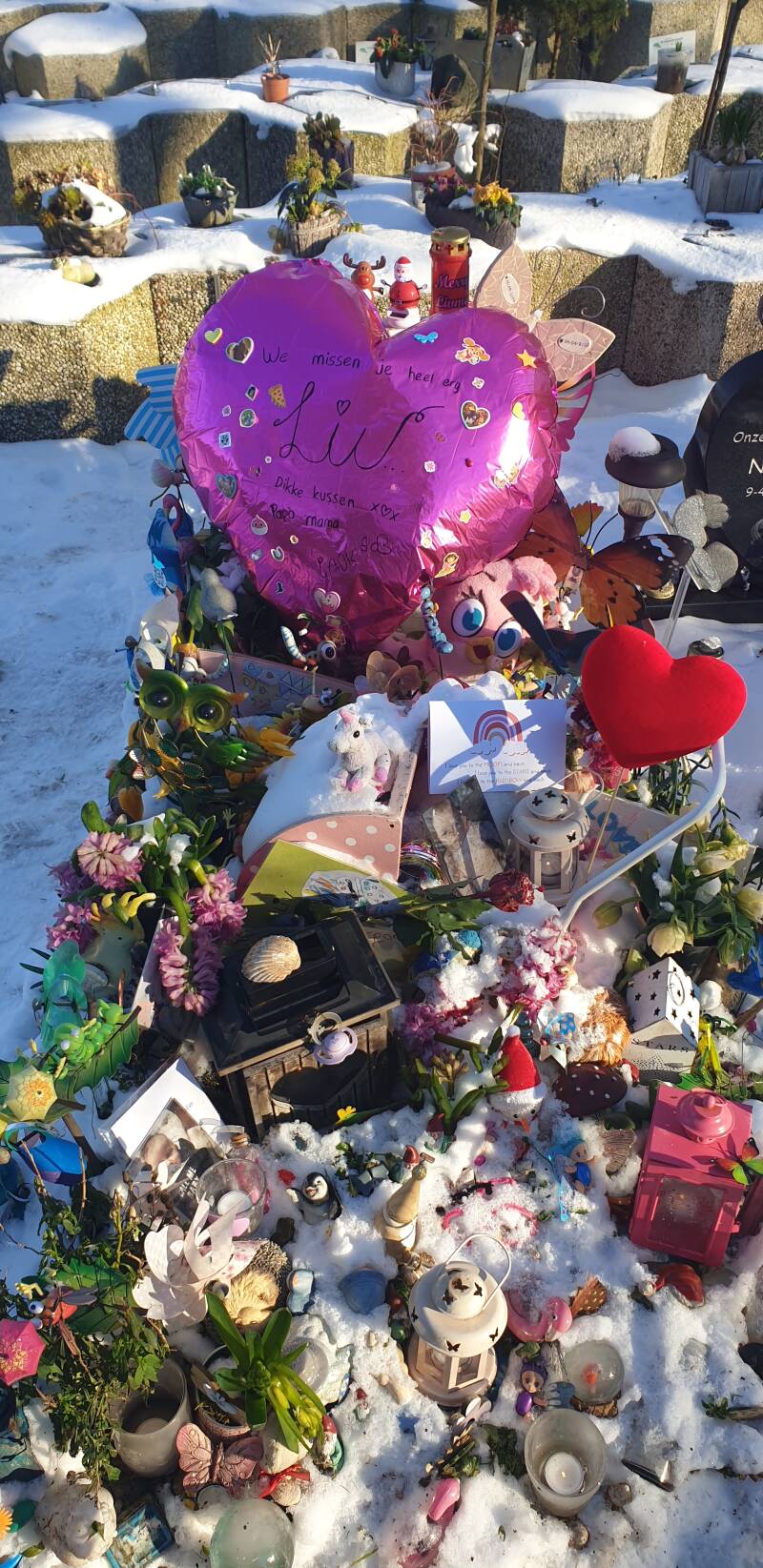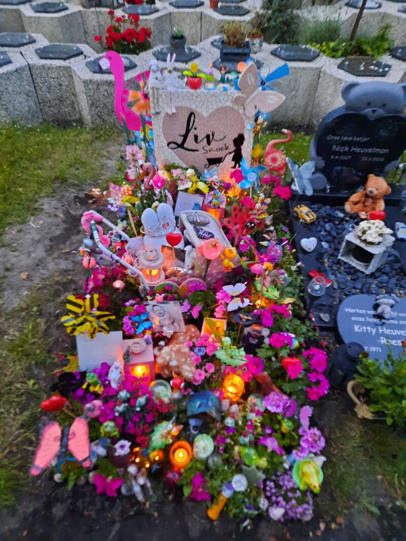 Ongeveer een week of 2 later kwam Arno savonds thuis van Liv en was helemaal overstuur. Er was een graf gegraven naast haar. Tenminste, Liv ligt in een rijtje van 5 waarvan zij de laatste is. Naast haar is nog een meter over 2 of 3 gras en dan het pad. Op het gras picknicken wij wel eens of we eten er een ijsje, zitten even bij haar. En nu was er tegen het pad aan een graf gegraven. Arno en ik vonden dit lastig om te zien. Een kindergrafje. De dag erna ging ik zelf naar Liv en toen ik de begraafplaats op liep kwam de beheerder gelijk naar me toe. "Hay Melissa, ik moet je iets vertellen, er is zojuist een begrafenis geweest van het gevonden baby'tje, ik had het jullie willen vertellen maar het moest geheim blijven omdat ze bang waren dat er veel pers op af zou komen." Ik vroeg hem of hij haar expres naast het pad op het hoekje had begraven omdat ze haar dan misschien makkelijker op konden graven voor onderzoek mocht dat nog nodig zijn. "Nee, ik heb expres haar niet pal naast Liv gelegd maar er wat gras tussen laten zitten, omdat ik weet dat jullie dit moeilijk vinden." Toen barste ik in tranen uit en kon alleen maar stamelen "bedankt! Ontzettend bedankt." Het idee dat er gegraven word zo dicht naast mijn meisje, dat iemand weer zo dicht hij haar is, dat idee vind ik zo pijnlijk. Je weet dat de dag ooit gaat komen dat er een kindje naast komt. Maar hopelijk gebeurd het nog lang niet of nog beter nooit!! Ik bedacht me gelijk wat zou ik doen als ik daar was en er ligt een open graf naast haar. Je bent dan zo dichtbij, kunt zo dichtbij haar komen, ik zou de drang moeten weerstaan om dan haar niet op te graven want mijn verlangen maar haar is zo mega groot!