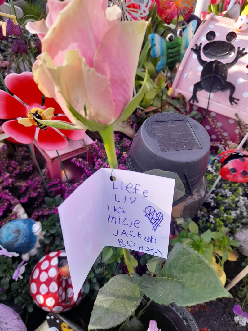 Toen kwam 4 april, wat kan ik erover zeggen. We zijn met de jongens naar safari park beekse bergen gewees. Zij hadden een leuke dag wij voelden ons shit. De dag ervoor ben ik met ze naar de bloemenzaak geweest, beide hebben ze een mooie bloem voor Liv uitgezocht. Jack had zelf een kaartje en een pen gepakt en kwam naar me toe, dit moet eraan mam. "Liefe Liv ik mis je." Ontroerend, hartverscheurend en zo ontzettend lief! We hebben het 4 april bij haar gebracht voor we naar de beekse bergen gingen. We hebben ook weer veel kaartjes en berichtjes en bezoekjes aan zowel liv als aan ons mogen ontvangen. Ik kan niet vaak genoeg benoemen hoe fijn dit voor ons is en hoe dit helpt. Dat niemand Liv vergeten is, en iedereen de datum weet.